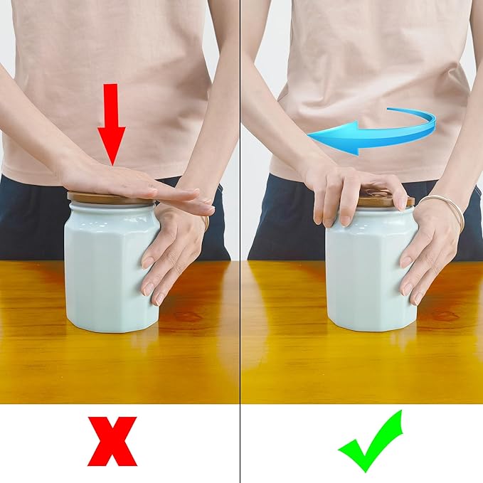 • 【Easy to Use and Clean】Please don't directly to direct downward pressure on the lid, The best way to seal is to twist the lid and press it at the same time.The sugar flour container set for counter set features a large diameter jar mouth design, which can be quickly and easily filled or cleaned. The ceramic kitchen canisters is dishwasher safe, and the wooden lid can only be hand washed and needs to be wiped dry in time.