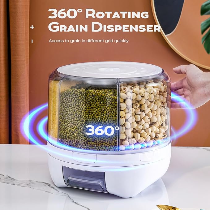 Grain Dispenser, 360° Rotating Storage Container, 6 Grid Food Dispenser with Storage Sealed Lid, Rice Dispenser for Grains, Beans, Rice, Peanut, Barley
