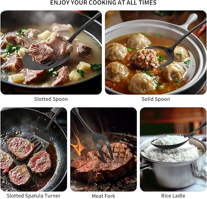• Extended Handle with Hanging Hole & Enhanced Safety: Our cooking utensils feature handles noticeably longer than standard designs, providing extra reach and safety. The extended length keeps hands farther from heat and splattering oil, while the built-in hanging hole ensures easy vertical storage to save space and promote drying.