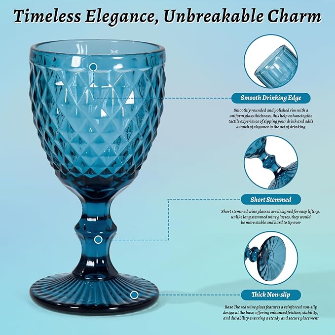 • Versatile Usage: These vintage-style wine glasses are not limited to wine alone. They can be used for a variety of beverages such as juice, soda, iced tea, and water. This versatility makes them suitable for any occasion, whether it's a casual gathering or a formal celebration. You can use them for everyday use or reserve them for special events, making them a practical and versatile addition to your glassware collection.