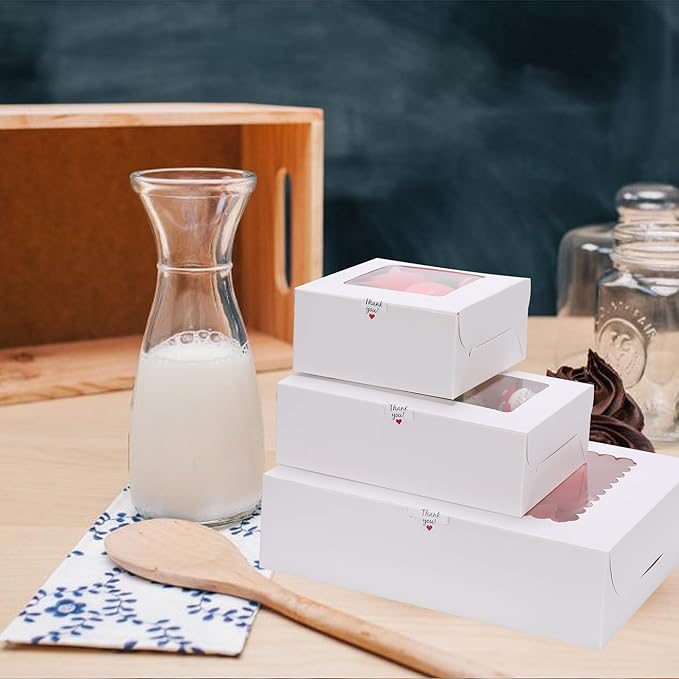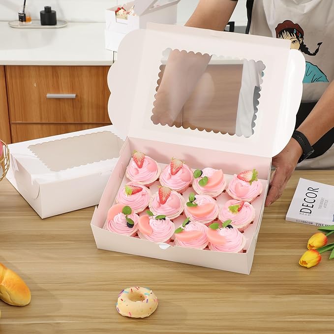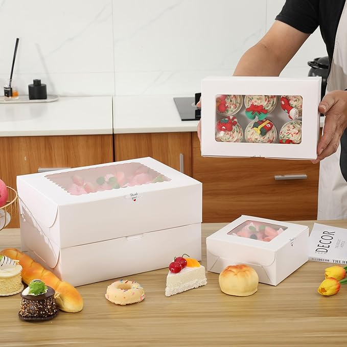 • What you can get: 20packs-12count White Paper bakery boxes with Pvc Window, 24 yards ribbons and 24 pcs white sticker.The internal support can protect 12 standard sized cupcakes or muffins during transport