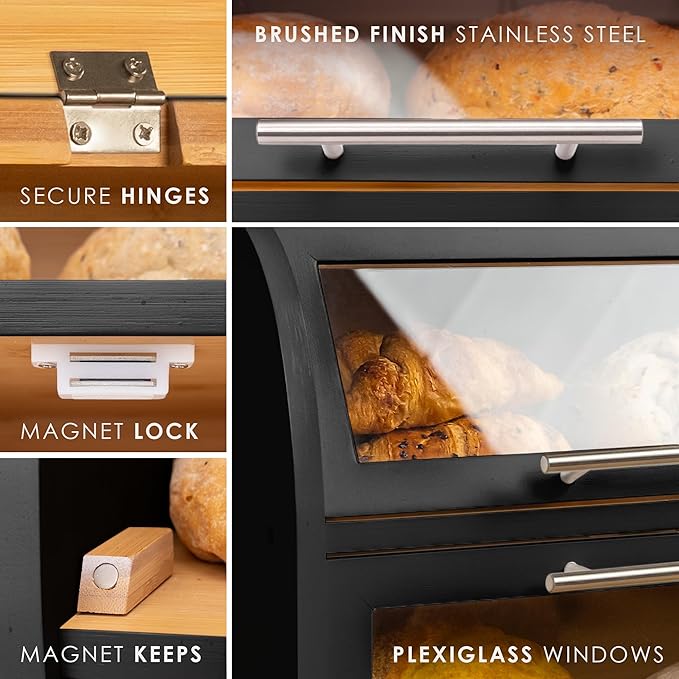 - DESIGNED TO KEEP YOU AND YOUR KITCHEN HAPPY Here’s a functional bread storage container with all the warmth of wood, ready to go to work in the heart of your kitchen. Stylish, contemporary double compartment design blends generous storage space with eye-catching allure. Crystal clear plexiglass windows showcase your bread in all its glory, ready to serve fresh 24/7. **U.S. Patent Number D945,222 ***