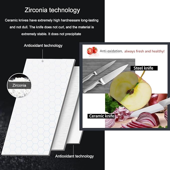 • RUST-RESISTANT & EASY TO MAINTAIN - This ceramic knife has a glaze made of zirconia material, which maintains its appearance and cutting performance over time. It is also stain resistant, ensuring that your ingredients maintain their natural flavor without any metallic taste.