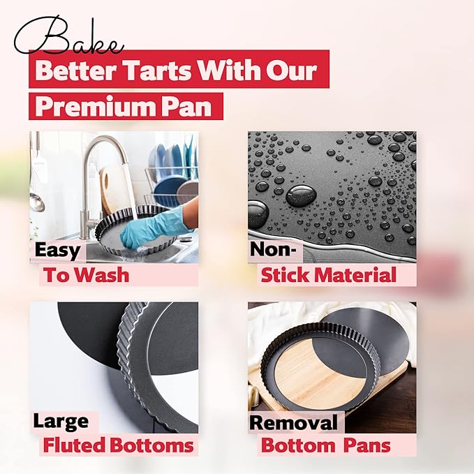 • ❖ Enjoy Secure Baking: Keep your kitchen safe with our food-grade tart pans. Our non-stick tart mold is free from PFOA, BPA, and PTFE. The edges of the pan are not sharp, and it is polished with special care to protect your fingers while handling it