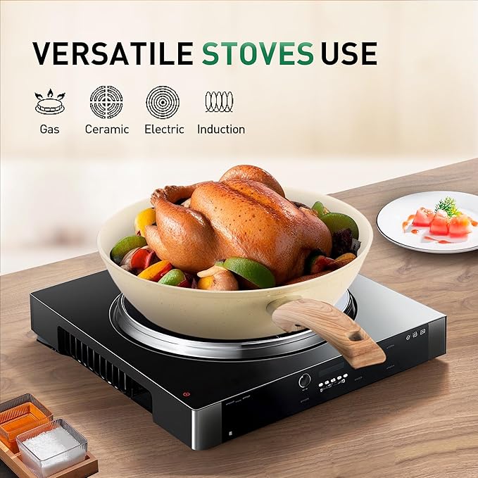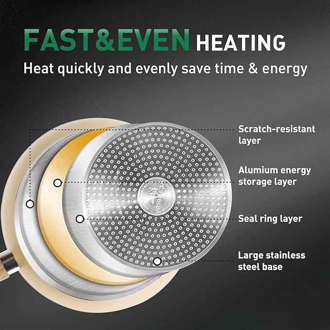 • Heats Quickly & Evenly: This cookware uses professional grade aluminum core that conducts heat quickly and evenly with precise temperature control, which will save time and energy. This induction frying pan set can adopts various cooking methods to make delicious food to satisfy your stomach