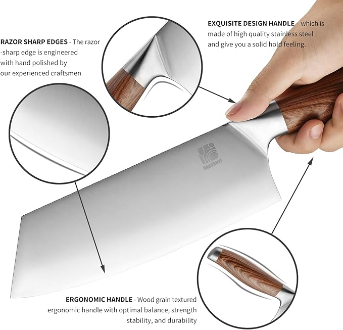 - Ergonomic design: the advanced stainless steel wood grain handle design minimizes wrist tension, has a special appearance and provides a safe and comfortable grip, regardless of the size or grip position of the hand. This special texture is smoother and more stable than the traditional wooden handle. It is also more hygienic, will not swell and crack, and ensures the highest standard of food safety.