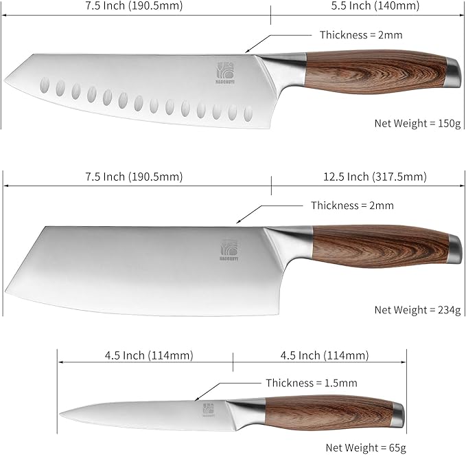 - Premium Quality Knife Set: The HAOCHUYI Chef Knife Set includes a 5" utility knife, 7" santoku knife, and 8" chef's knife. Crafted with high-quality steel, each knife is meticulously forged by skilled artisans. From heat treatment and forging to edge grinding and assembly, our knives combine cutting-edge kitchen technology with high-end design concepts. This set is carefully detailed to meet various cooking needs, making it an essential addition to any kitchen