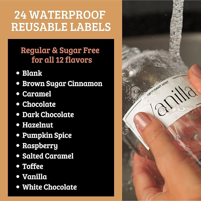 • 24 Syrup Labels: Our syrup dispenser bottle includes 24 waterproof vinyl coffee syrup labels, designed for various flavors such as vanilla, caramel, hazelnut, mocha, sugar-free flavors, simple syrup and more. This durable glass dispenser label simplifies coffee station organization for effortless flavor customization with every brew.
