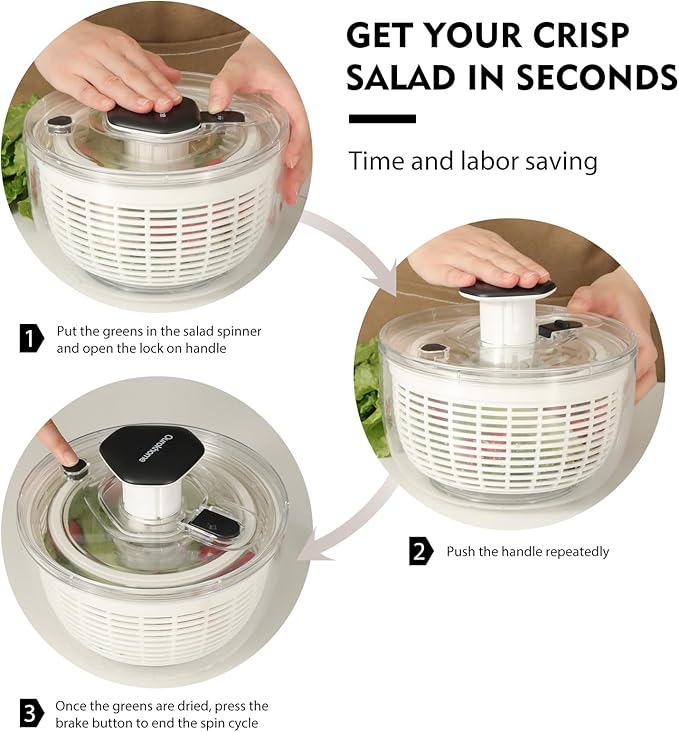 • Quick push and one handed operation salad spinner: Press the handle, the inner basket will rotate smoothly and stable at high speed, so it will separate and remove water from greens in seconds. It works equally well for left and right-handed users