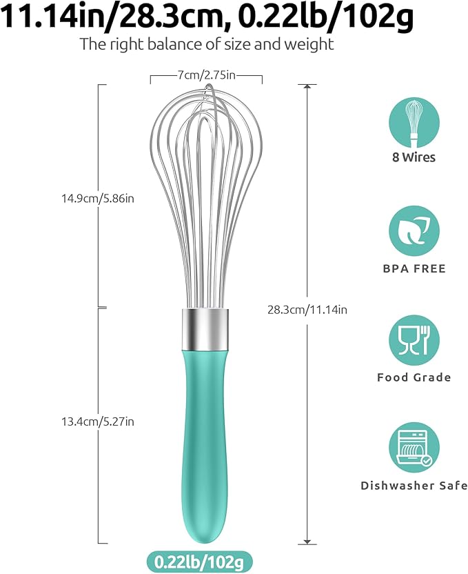- [18/10 Stainless Steel Wires and Silicone Handle] The 18/10 stainless steel wires are sturdy, rust resistance. They will not bending in your pancake batter and it also holds up to even the thickest of batters and frostings. The food grade silicone handle offers a comfy and non-slip grip and the silicone texture for holding tight with potentially wet hands. This dishwasher safe whisk has the right balance of size and weight. You can rest it in a bowl and it doesn’t flip out.