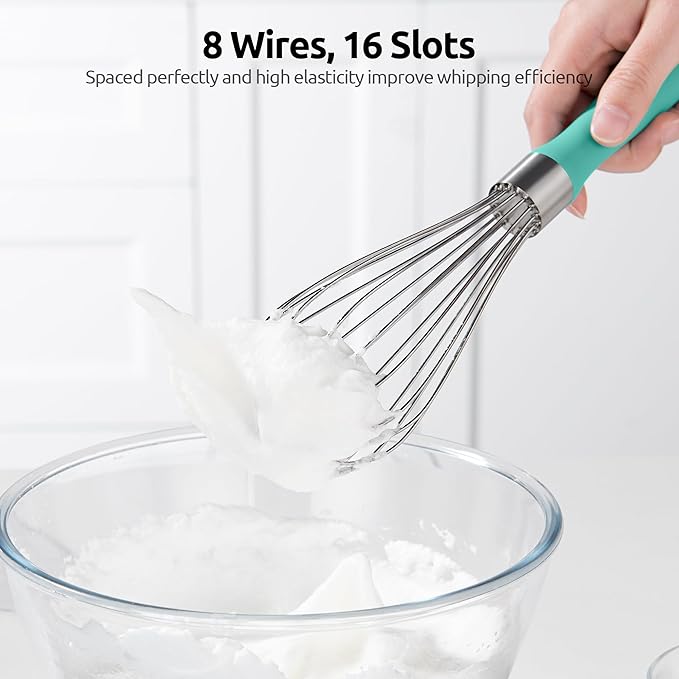 - [8 High Flex Wires for Efficient Whisking] With 8 flexible wires and the high elastic 18/10 stainless steel material, this 8-wires cooking whisk has the right amount of flex to create that "whip" effect by adding more air to the mix. Wires are spaced perfectly for whipping and mixing and release anything holding on easily with just a quick rinse and scrub. It can whip up anything quickly and efficiently. 1.4mm thick wire has a right balance between strength and whisking efficiency.