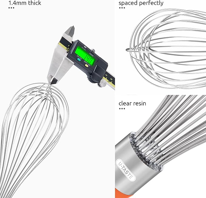 - [Sealed Up with Clear Food Grade Resin] U-Taste balloon whisk is sealed up around the base of the wires where they join the handle with food grade resin to ensure that the no food bits or water can get in or rust. You can use this metal whisk for beating, whisking and whipping task without worrying about the food get caught up in the handle and wire. The balloon shape is perfect for whisking eggs, sauces, creams, gravies and dressings and it also strong enough to beat a heavy sauce or frosting.