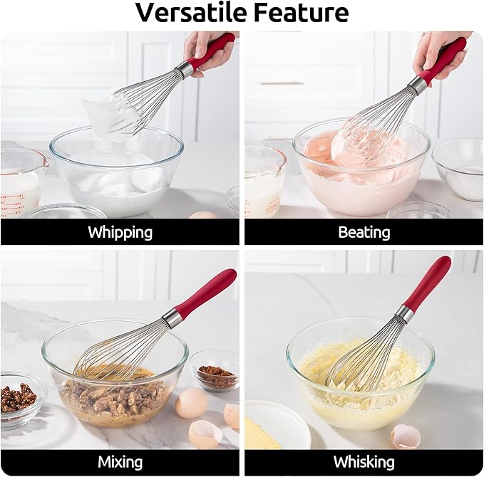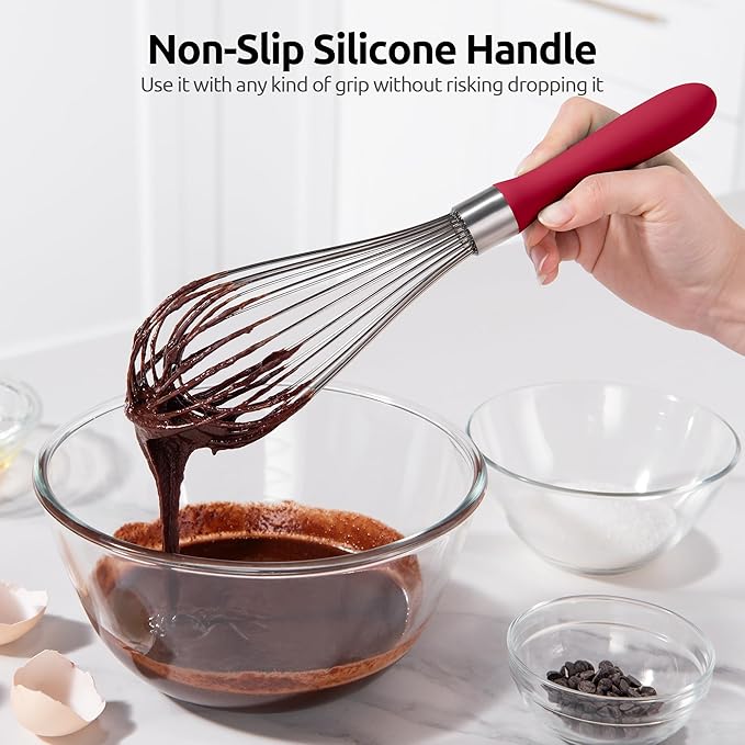 - [18/10 Stainless Steel Wires and Silicone Handle] The 18/10 stainless steel wires are sturdy, rust resistance. They will not bending in your pancake batter and it also holds up to even the thickest of batters and frostings. The food grade silicone handle offers a comfy and non-slip grip and the silicone texture for holding tight with potentially wet hands. This dishwasher safe whisk has the right balance of size and weight. You can rest it in a bowl and it doesn’t flip out.