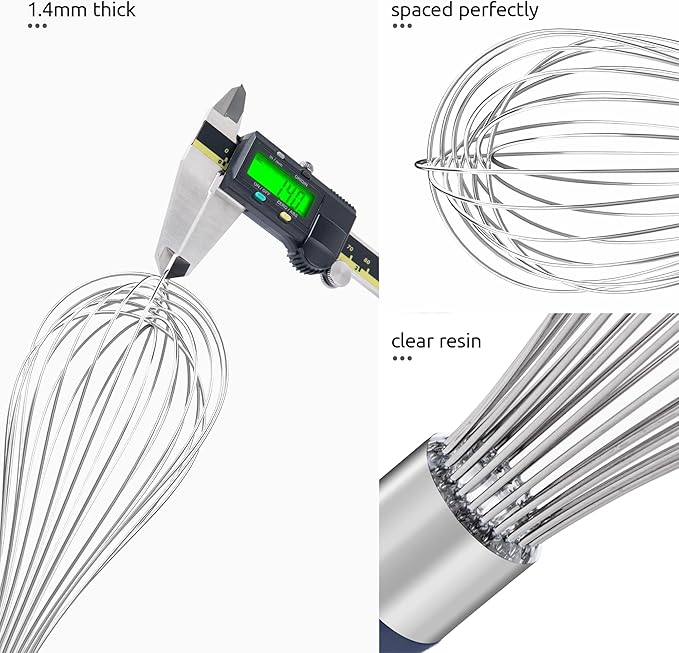 - [12 High Flex Wires for Efficient Whisking] With 2 more wires than other kitchen whisk and the high elastic 18/10 stainless steel material, this 12-wires cooking whisk has the right amount of flex to create that "whip" effect by adding more air to the mix. All 1.4mm thick wires are spaced perfectly for whipping and mixing and release anything holding on easily with just a quick rinse and scrub. You will be surprised at how quickly the egg whites come to firm peaks with this metal whisk.