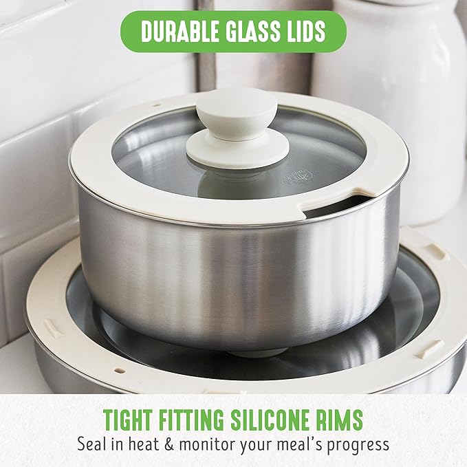 • GLASS LIDS WITH SILICONE RIMS: Each durable glass lid features a tight fitting silicone rim to seal in heat while you watch from above