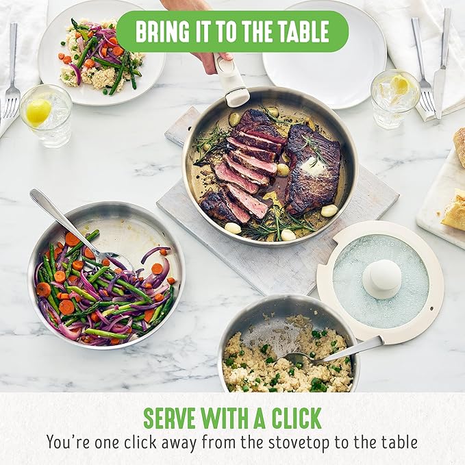 • DETACHABLE HANDLES: Each pan features stay-cool removable handles – just click on to cook and transfer then click off to serve and store