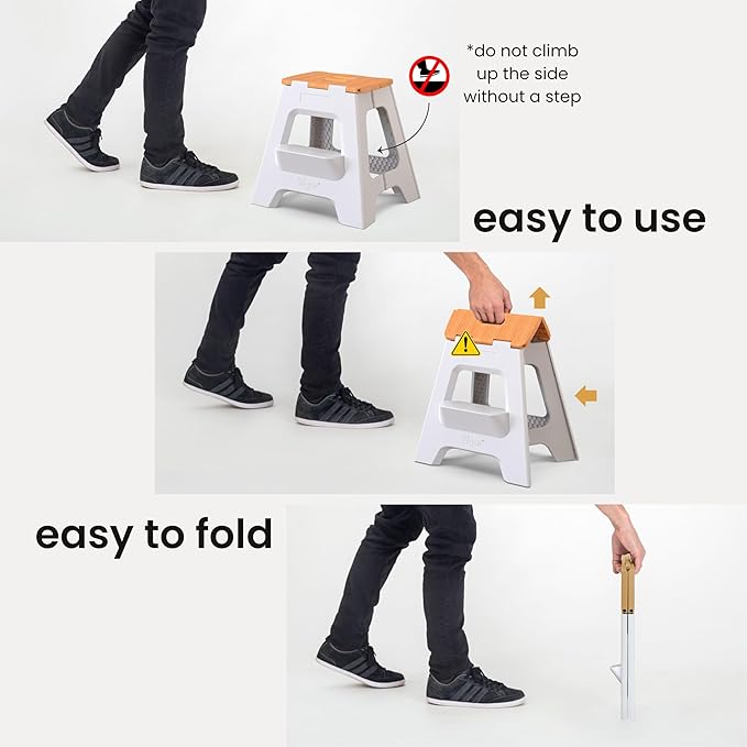 • Step Stool with Handle: The foldable stools for adults feature anti-slip grips, a durable textured base, and stabilizing rubber feet to prevent slipping. This ensures the foldable step stool stays securely in place and safe stepping stool for adults.