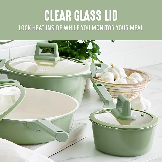 GreenLife 8 Piece Ceramic Nonstick Cookware Set, Induction Suitable Non Toxic PFAS-Free Pots & Pans, Dishwasher Safe, Cooking Set, Stock Pot, Saucepans & Frying Pans, Kitchen Cooking, Sage Green