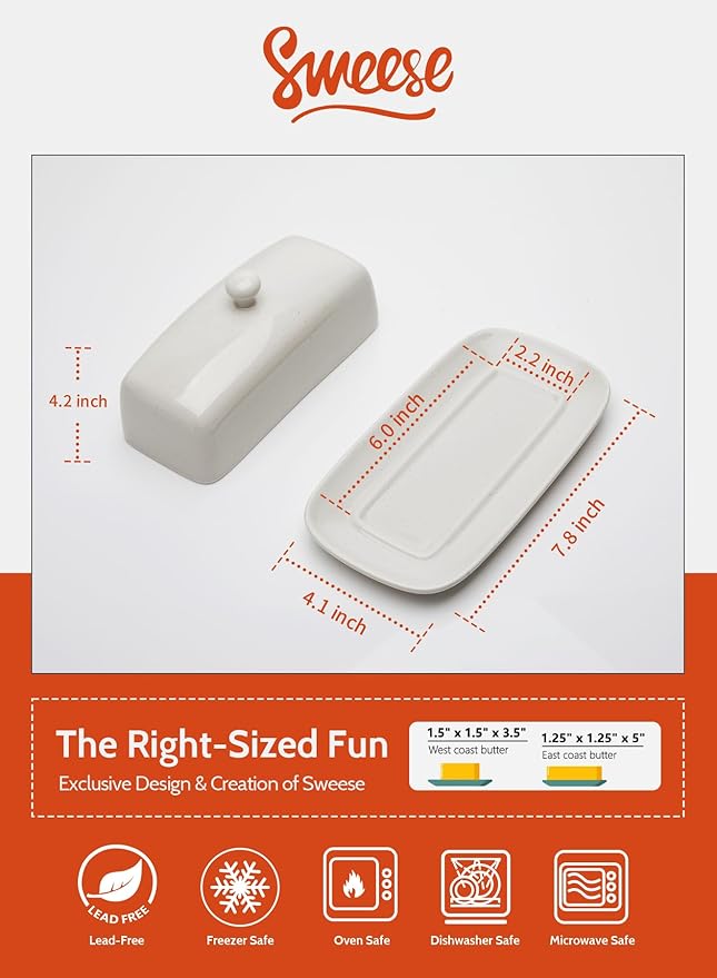 • Elegant & Minimalist Style - The Sweese butter dish is clean, pure, and has a smooth and shiny appearance, which complements the kitchen. The elegant and simple curved design makes the butter keeper look very high-end and fits perfectly with any decoration style. Butter dishes are available in various colors and can be easily combined with other cookware to create a rich and harmonious color ambiance.