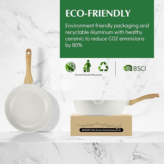 • Building a Green Future Starts in Your Kitchen - Made with recycled aluminum, reduces CO₂ emissions by 80%. Our eco-conscious cookware delivers professional performance while reducing environmental impact.