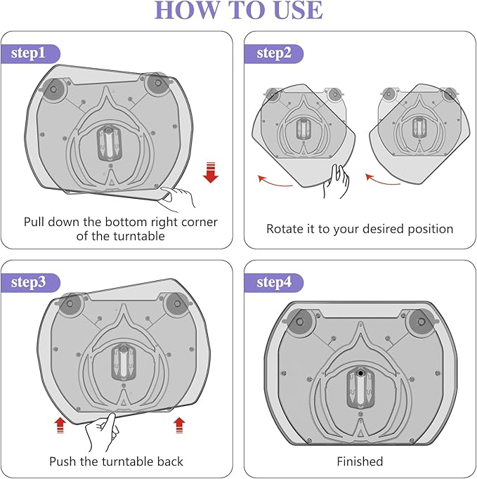 • Easy to Clean: The Lazy Susan Turntable is made of removable PET material, making cleaning easier. You can easily dismantle the parts for thorough cleaning. Most of the accessories can be washed directly in water or wiped with a damp cloth, ensuring more efficient cleaning.DON'T USE THE DISHWASHER, MICROWAVE, OR OVEN.