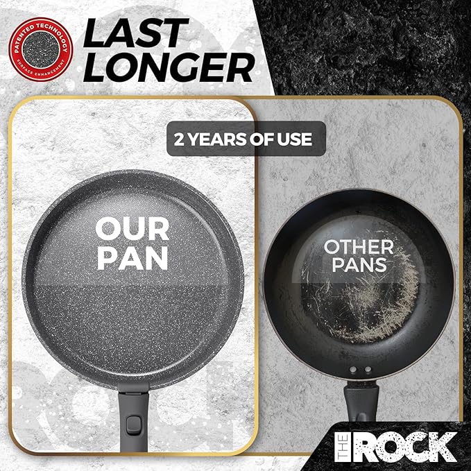 • 3x More Durable: The Patented Rock.Tec manufacturing process strengthens the surface of the cookware creating an ultra-hard, rock-like surface. The result is an outstanding release performance, 3x better than the standard non-stick cookware