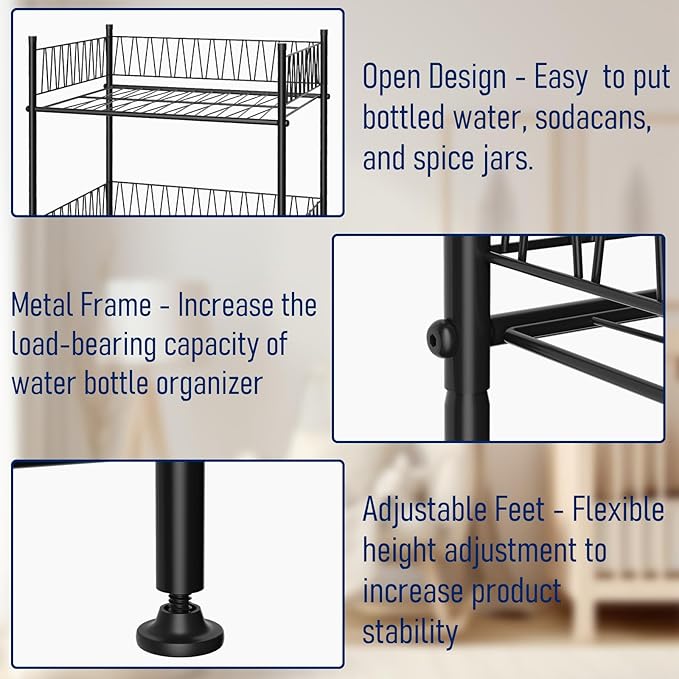 • Practical Storage Rack: It is not only used as a water bottle storage organizer in the kitchen or pantry to store bottled water, soda cans, canned food, milk, and snacks, but also as a bathroom shelves freestanding to store towels, toilet paper rolls, and toiletries.