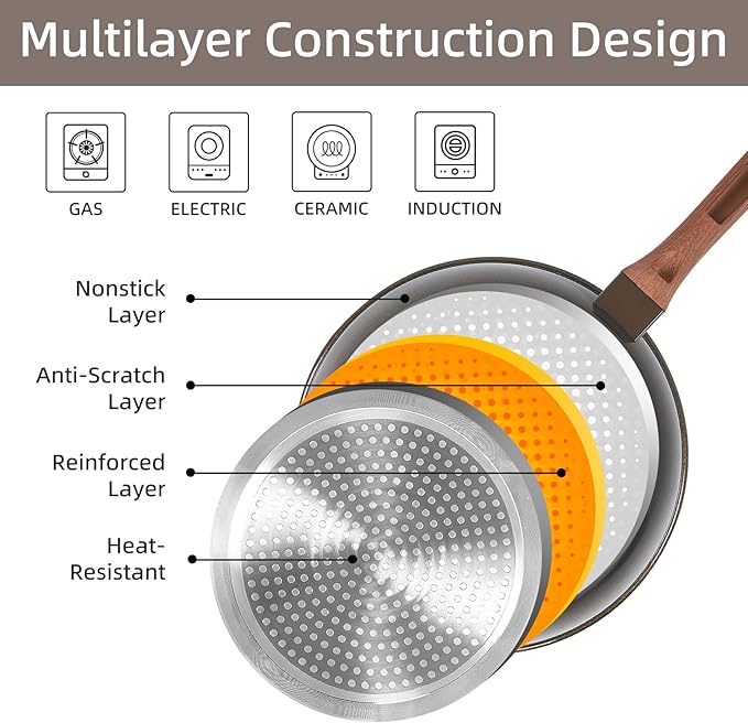 • [Kitchen Utensils Set]: Comes with 9.5-inch and 11 inch frying pans, 1.5QT covered frying pans, 5QT covered soup pots, and 11 inch covered stir fry pans. This set of pots and pans includes everything you need for daily cooking. Additionally, a silicone spatula and a silicone spoon will be included as a gift