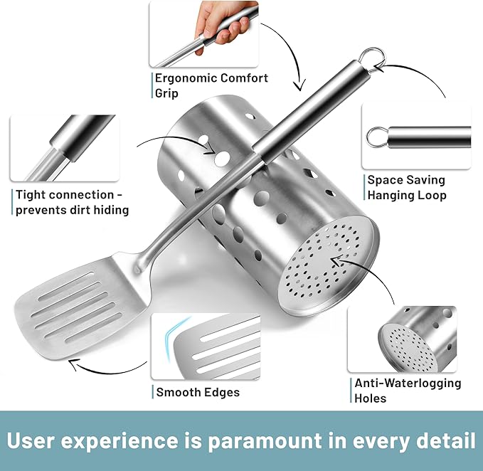 - 【Save Space】Our cooking utensils set is designed with a built-in hanging hole at the top of the handle for easy hanging and storage. As well as keeping your kitchen tidy and saving space, it also allows kitchen utensils to be hung vertically to drain, keeping them dry and hygienic