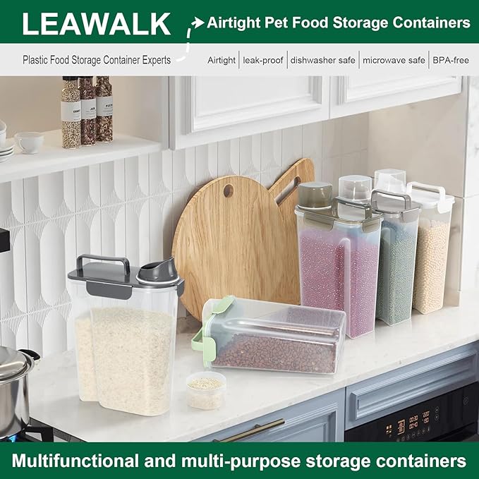 • MULTI-PUrRPOSE STORAGE:Our pet food container is suitable for storing dog food、cat food、bird seed、fish food、rice、 dry food、cereals、oats、cat litter 、flour and other large and small grains, as well as washing powder used at home. It is also a good choice.