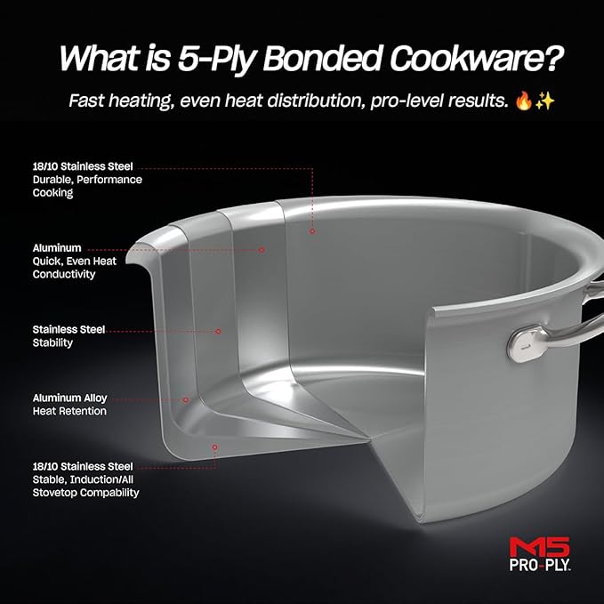 • 5-LAYER BONDED CONSTRUCTION: Delivers fast, even heating with no hot spots—so your food cooks more evenly every time. Made with premium 18/10 stainless steel and a 3-layer aluminum core for long-lasting performance. The 3mm thick body retains heat better and resists warping, even under high heat.