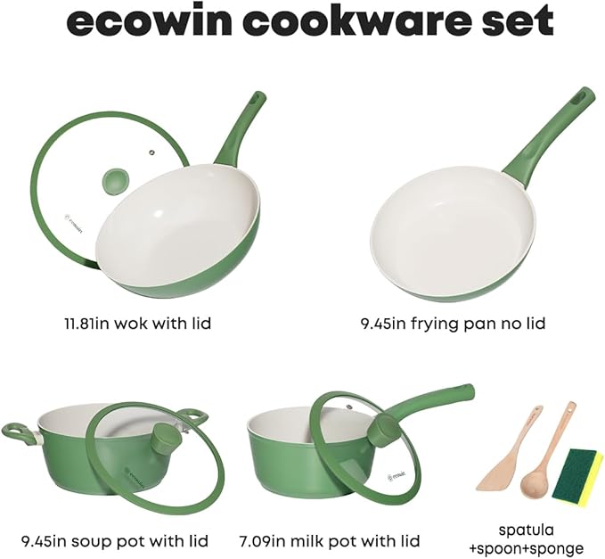• Cookware set:9.5Inch Frying Pan, 11.8Inch Deep Frying Pan with Lid, 7Inch milk Pot with Lid, 9.5Inch Soup Pot with Lid, Sponge And Woodle Spatula and Spoon.