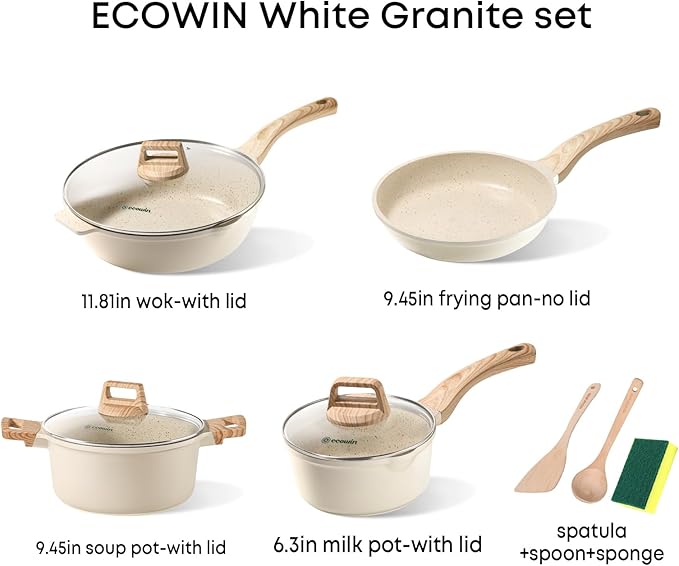 • 10 Piece Cookware Set:9.5Inch Frying Pan, 11.8Inch Deep Frying Pan with Lid, 6.3Inch milk Pot with Lid, 9.5Inch Soup Pot with Lid, Sponge And Woodle Spatula and Spoon.