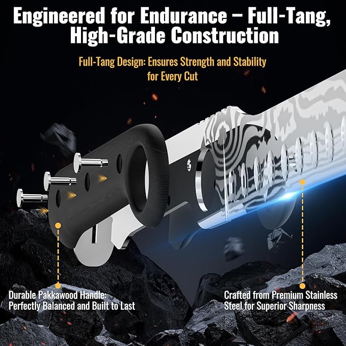 • Balanced Full-Tang Construction – Built with a durable full-tang structure, this knife offers exceptional strength, balance, and longevity, ensuring comfortable handling and precise cutting for years to come.