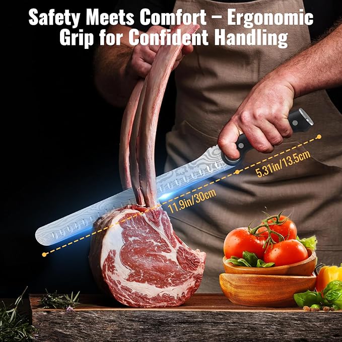 12-Inch Slicing Carving Knife with Unique Grip Ring & Non-slip Serrated Spine | Ultra-Sharp High-Carbon Stainless Steel Blade & Damascus Pattern for Brisket Meat Cutting | Pakka Wood Handle