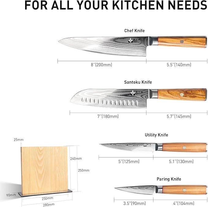 • PREMIUM DAMASCUS VG10 STEEL: Made of 67-Layer Damascus VG-10 steel, our knives have a high level of rust-resistance, wear resistance, and long-lasting performance. Each blade undergoes ultra-precise vacuum heat treatment to get incredible Rockwell hardness of 60±2 HRC. This set includes chef knife, santoku knife, utility knife and paring knife, block