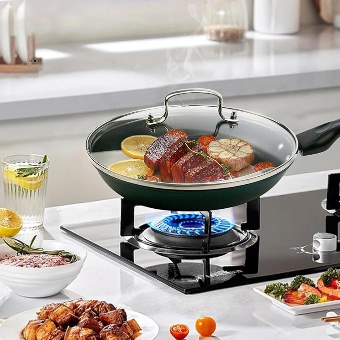• LEAK PROOF VENT: The pan lid features with a metal steam release vent to release excess steam escape, avoids accidental spillover. It also circulates heat and steam to more evenly cook delicious meals. The vent helps the tempered glass lid to better withstand drastic temperature changes and to avoid shatter under pressure.