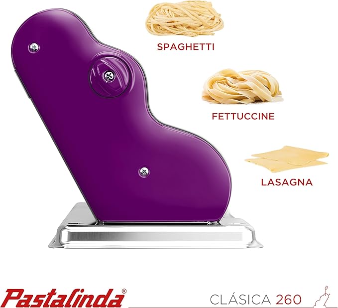 PASTALINDA Classic 260 Pasta Maker Machine, 26 cm Wide Rollers, 9 Thickness Positions, 2 Cutting Positions, Stainless Steel. Includes Reinforced Hand Crank And Two Clamps (Violet)