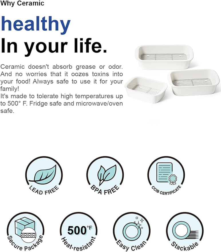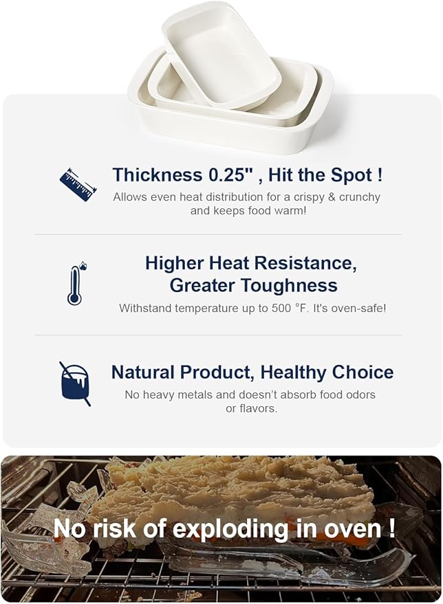 • High-Quality, Safe Ceramic: Made from durable, lead-free ceramic, this casserole dishes set is oven-safe up to 500°F and is also microwave, dishwasher, and freezer safe. Non-stick ceramic and rounded corners make cleaning easier. *Do not use directly on the stove