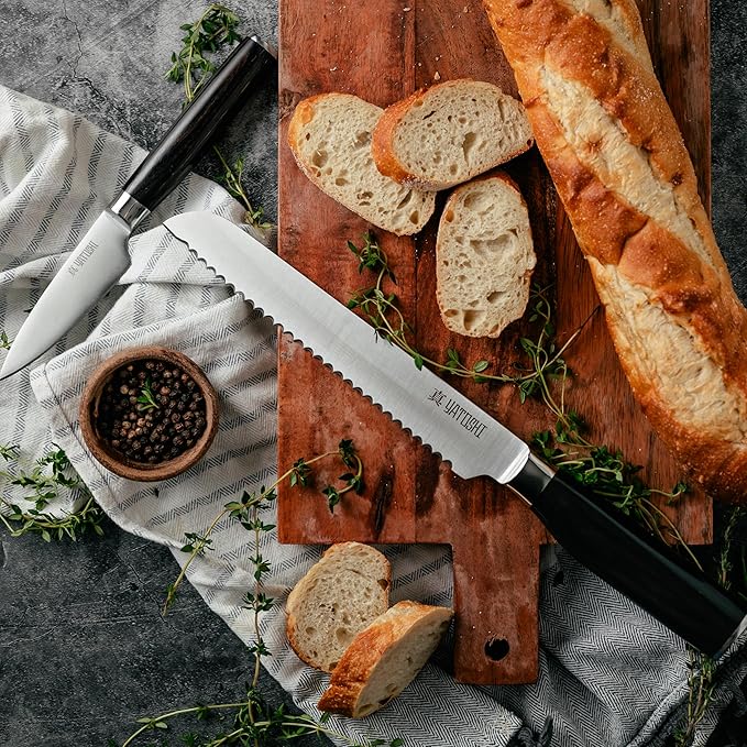• Set Includes: 1x 8” Chef Knife, 1x 8" Bread Knife, 1x 7” Santoku Knife, 1x 5” Santoku Knife, 1x 5” Utility Knife, 1x 3.5” Paring Knife, 1x Utility Scissors, 1x Acacia Block