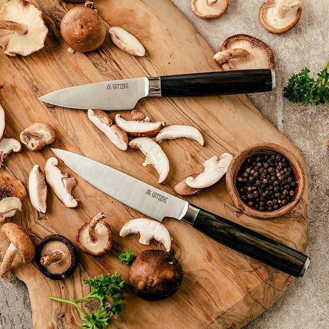 • High Carbon Blades: Made with premium 7Cr17 High Carbon Steel that provides a razor-sharp professional quality blade. The steel contains 0.6-0.75 carbon, making it two times tougher than other knives in its class with a Rockwell Hardness of 57-58.