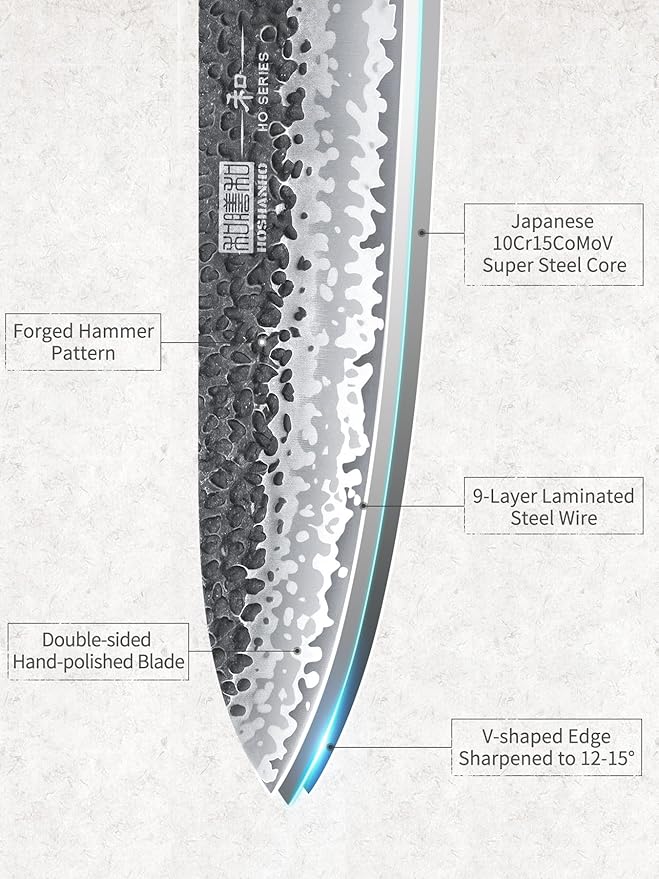 • 【Japanese High Carbon Steel Core】9 layers of high carbon steel forged, steel core is made of high hardness Japan 10Cr15CoMoV super steel, the outside 8 layers of corrosion-resistant and rust-proof composite steel wrapped around the steel core to form a stable sandwich structure for longer service life
