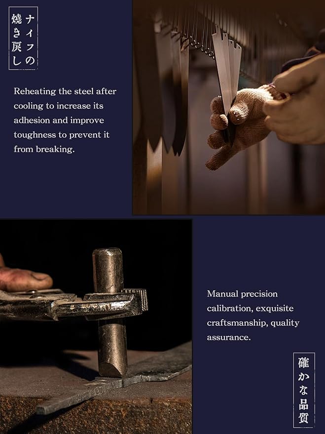 • 【Traditional Hand Forging】Each kitchen knife is the result of 60 days of meticulous craftsmanship by a craftsman; The hand-forged hammer pattern and layered lines naturally formed by multiple foldings of 9 layers of steel are all testimonies of Japanese traditional knife-making craftsmanship