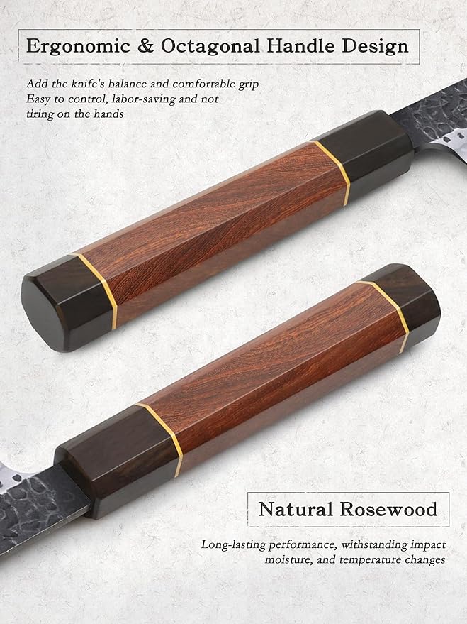 • 【Japanese Traditional Octagonal Handle】Ergonomically octagonal handle can provide a firm and safe grip and improve accuracy, ensuring reduced fatigue during extended kitchen sessions; High-quality rosewood combined with two copper wires embodies the details, which is both fashionable and noble