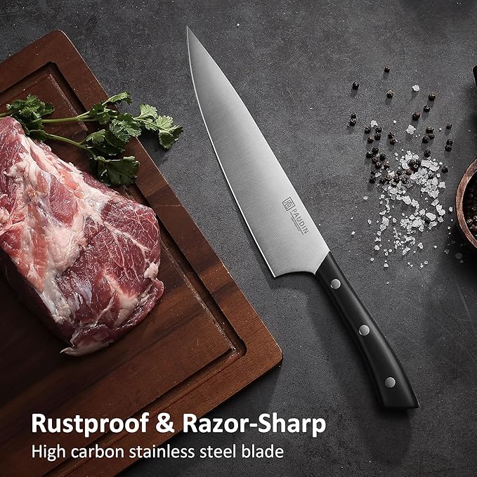 • GERMAN STAINLESS STEEL: Made from high-carbon 1.4116 German stainless steel, these rust-resistant blades handle all kitchen tasks with precision. Satin-finished for durability and effortless cutting.