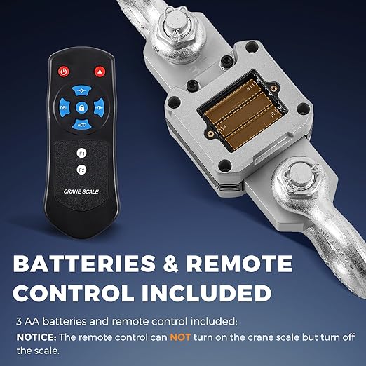 • BATTERIES & REMOTE CONTROL INCLUDED- 3 AA batteries and remote control included; NOTICE: The remote control can NOT turn on the crane scale but turn off the scale.