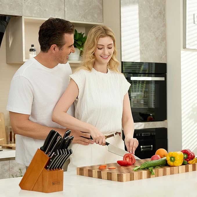 • Superior Craftsmanship: A hand-polished edge at a 15-degree angle per side achieves its ultimate sharpness, ensuring dependable performance. The block knife set features professional-grade matte finish blades with precise cutting capabilities that have been finely honed to ensure lasting sharpness.
