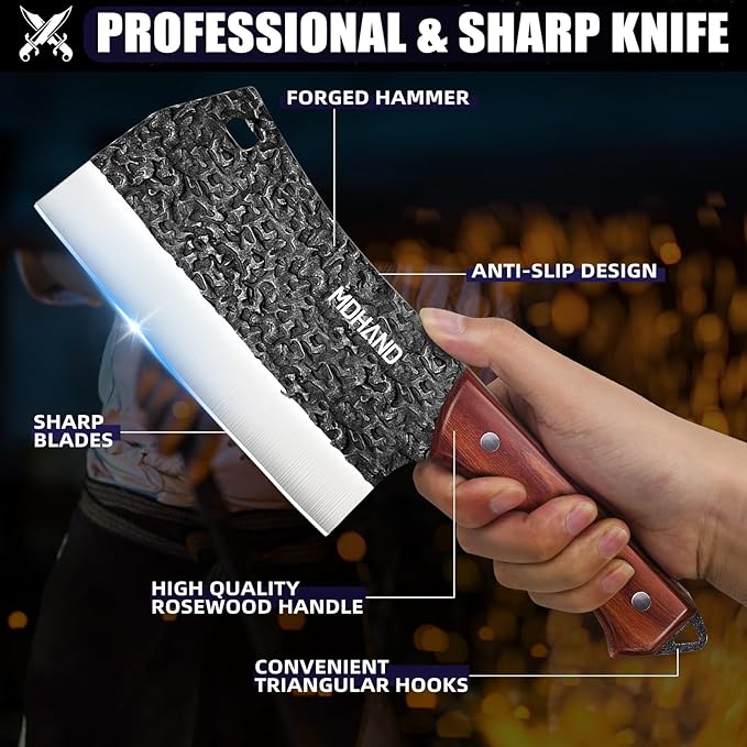 - đȘăSuper Sharp BladeăThis cleaver is made of high-carbon stainless steel, and sharpness is the most important feature for any cleaver. At MDHAND, our knives are hand-polished by craftsmen with decades of experience to ensure the ultimate sharpness of 15~17 degrees, the unique hammer texture and black coating design of the knives not only highlight the fashion sense of the knives, but also effectively prevent the food from sticking together when cutting, making your cooking process smoother.