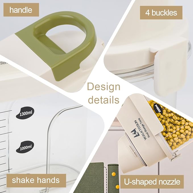 • 【Effortless Pouring & Smart Measuring‌】:Enjoy mess-free pouring with our wide spout and easy-to-grip ergonomic handle design. The visible clear 1300ml cereal dispenser features measurement markings for perfect portions every time. Bonus: The dust-proof lid doubles as a measuring cup! Say goodbye to spills and guesswork in your kitchen