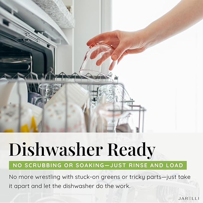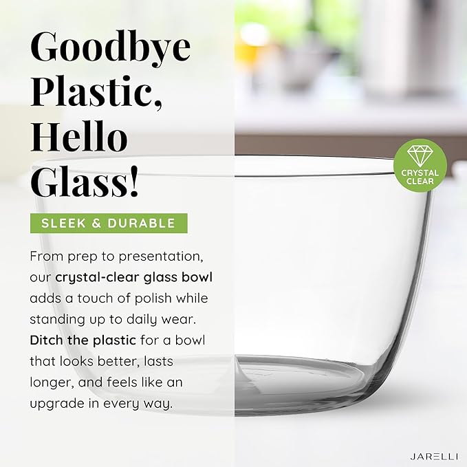 • ELEGANT AND DURABLE! The Jarelli bowl of our salad lettuce spinner is constructed from high borosilicate glass easily resisting wear and tear. The food basket, lid, handle, and base are all made from food-grade plastic material and are BPA-free. Enjoy fresh salads with the assurance that your health is a top priority.